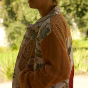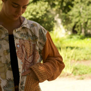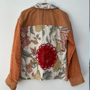 Chaqueta manga larga, hecha de distintos materiales: cubrecama vintage de algodón, mantel de invierno y un pañito de crochet en la espalda. Tiene diseños vintage florales.