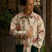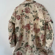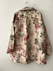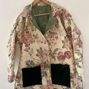 Chaqueta largar hecha de una cortina vintage de diseños románticos, forro interior de algodón, teñido a mano y bolsillos.